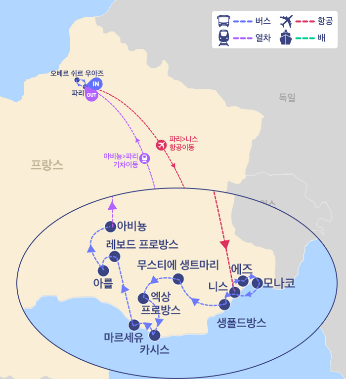 ※ 상기 이미지는 실제와 다를 수 있으며, 현지 사정에 따라 동일 메뉴의 다른 식당으로 대체 될 수 있습니다.● 프랑스내 국내선 이동 1회 (파리-니스) & TGV 이동 1회 (파리-아비뇽) (일부 날짜는 천재지변, 파업 등 현지사정에 따라 변동될 수 있습니다.) ● 45인승 이상 대형버스 이용 ● 더 깊이있는 경험, 안전한 여행을 위한 전일정 전문투어리더 동행[ 입장 관광지 ]* 고흐, 세잔, 모네 등 인상파 화가들의 작품을 감상할 수 있는 오르세 미술관 내부 관람 * 세계에서 현존하는 가장 뛰어난 고딕 양식의 왕궁 아비뇽교황청 - 팔레 데 파프 내부 관람* 프랑스 프로방스를 대표하는 세계 최대 향수 회사 프라고나드 향수 공장 내부 관람* 고흐가 귀를 자르고 입원해서 머물던 병원 에스빠스 반 고흐 내부 관람* 샤갈의 성서에 관한 작품이 가장 많이 전시 되어 있는 니스 샤갈 미술관 내부 관람[ 기타 ]* 이코노미석 탑승 상품(상품코드 KW41B23)과 공동 행사 진행됩니다. * 최소 출발 인원은 20명 이며 최대 38명까지 진행될 수 있습니다.* 20명 이상 출발시 인천공항에서부터 도착까지 전일정 전문투어리더가 동행 안내해 드립니다.* 파리는 현지 가이드가 동행하며, 파리 외 남프랑스 지역은 전문투어리더가 진행 안내드립니다. * 니스 축제 등 현지 호텔 사정에 따라 주변의 다른 도시의 호텔로 변경 될 수 있습니다.